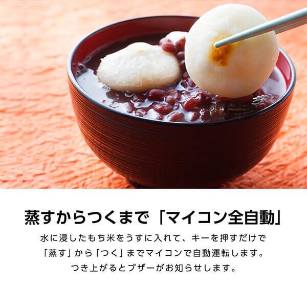 ●蒸すからつくまで 「マイコン全自動」水に浸したもち米をうすに入れて、キーを押すだけで「蒸す」から「つく」までマイコンで自動運転します。つき上がるとブザーでお知らせします。